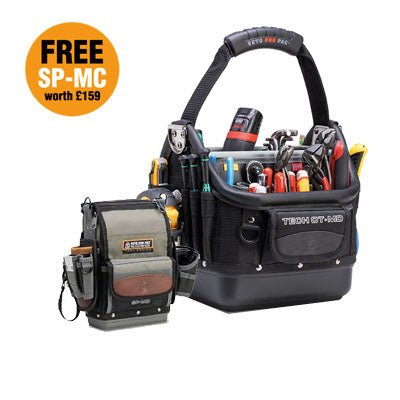 The TECH-MC BLACKOUT is a stealth version of our compact (2 inches shorter than the TECH-MCT), full-featured service, repair or installation tool bag that features everything you have come to expect from Veto Pro Pac: patented center panel, heavy duty construction and stabilizing injection molded waterproof base that keeps tools dry even in wet conditions. With 38 pockets, two storage bays and 10.5” (27cm) of vertical interior storage space, this bag offers maximum storage for hand tools, meters and cordless drills in the MC platform. The TECH MC BLACKOUT includes D-rings, bit extension and memory stick pockets, and a stainless steel tape clip as well as a quick access outside pocket for drill bit extensions and small items. Featuring Veto Pro Pac’s proprietary V-SWAP™ system. Alternative tool pocket panels are available separately and can be swapped-out enabling tool, gear or job specific storage solutions.