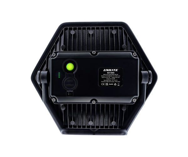 Ultra bright 5300 lumen 50W 6500K COB LED Hybrid - rechargeable and mains powered Takes up to 20V 6.0A batteries from Milwaukee, De Walt, Makita & Metabo - 4 adaptors included Super tough heavy duty nylon construction Easy carry rubber grip handle Rotating stand/base with holes for tripod/magnet 4 x dim settings: 650 / 1350 / 2700 / 5300 lumen Secure battery compartment cover (note: larger 6ah batteries may need to be used without cover) Safety automatic switch-over from mains to battery in the event of power failure 2A USB PowerBank - works with any battery installed 4 x Battery level and charging indicators Comes with 5 metre heavy duty 24V-2.7A H05RN-F charger/power lead (includes UK, EU, US & AU adaptors) Unilite 14.8V 5.2Ah battery available to purchase separately (NOTE: Only the Unilite battery can be charged via the lamp)