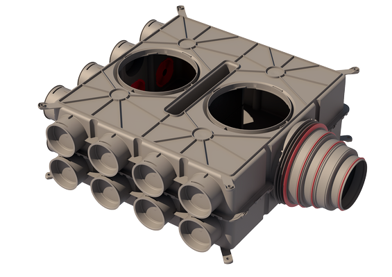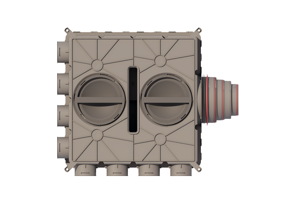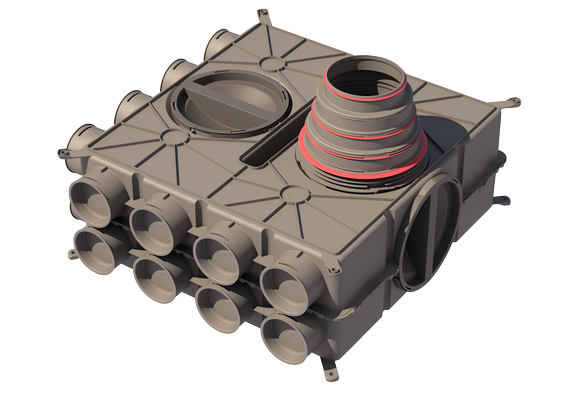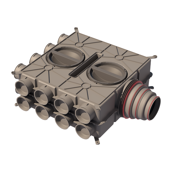 The Air Excellent DB816 is designed to radially distribute air from a ventilation unit, minimizing system pressure drop, fan energy use, and sound levels. It is compatible with Aerfoam insulated ducts and features 16 Air Excellent AE34C duct connections. With DBOX adaptors, it can connect to any duct diameter within the Air Excellent range. It offers flexible placement options on either the ceiling or wall and can be connected vertically or horizontally.