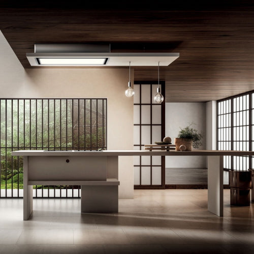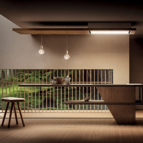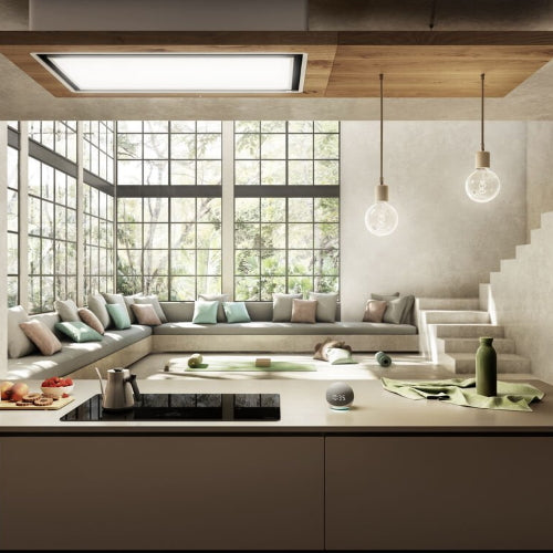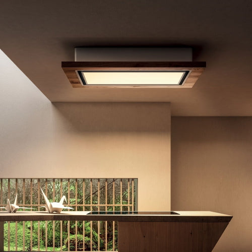 Lullaby was developed to effortlessly blend in with the surrounding architecture. Thanks to the additional shelves and lighting accessories, users have the freedom to personalise the style and dimensions of the hood, adapting it seamlessly into the room. Choose between two different materials to suit different kitchen finishes: aged oak, designed to inject warmth into any space and soft touch white lacquered wood, with a velvety visual look and tactile feel.