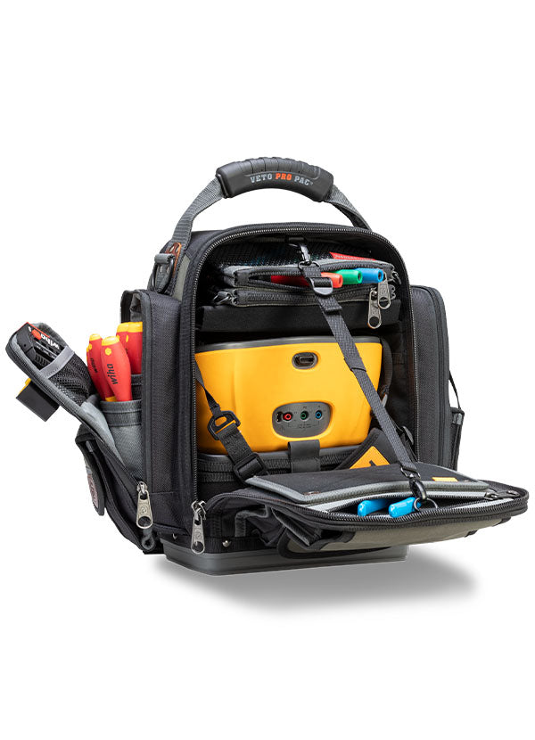 The MB5B Tester Bag is an extra large and highly-configurable front accessed bag designed for a Multifunction Tester (MFT). Once the bag is loaded out, it can be worn over both shoulders using the included backpack straps, over a single shoulder using the optional padded shoulder strap (sold separately), or at your side with over-molded gripped handle. Finally, the bag features an additional 8 pockets on the front flap as well as a padded tablet computer pocket on the back. The MB5B is offered in two configurations: MB5B Tool Bag for technicians in the United States and MB5B Tester Bag for technicians in the UK, Europe and the rest of the international professional trade community. The MB5B Tester Bag, designed for technicians outside of the United States, has been optimized for safely storing a Multifunction Tester (MFT) inside the bag while also accommodating hand tools in any of the exterior pockets. Each of the two padded, side mounted zippered meter pockets will securely fit meters up to 10”/26cm/260mm x 3.5”/9cm/ 90mm x 2”/50mm.