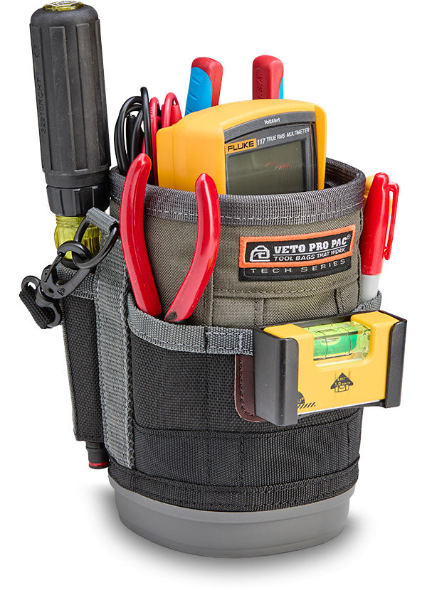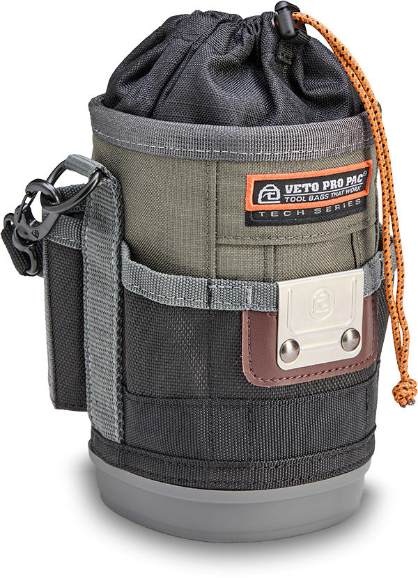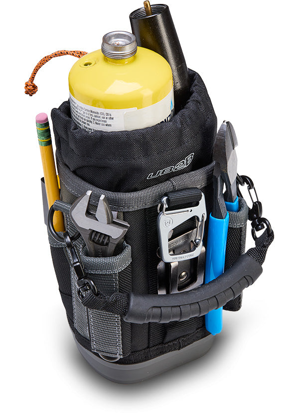 The UB2B is a medium, compact utility bag featuring an expandable or closable cinch-top bulk storage compartment with a water/oil resistant interior for easy clean up, perfect for storing fasteners, hand tools, a multi-meter, a water bottle (up to 3.5” / 8.9cm diameter), a map gas tank, etc. Built to handle any environment, it’s equipped with an impact and water-resistant, injection-moulded base that keeps the bag standing. For added versatility, the UB2B features a stainless- steel tape measure clip and 4 external pockets: 2 pass-through pockets for long hand tools, and 2 standard pockets for smaller tools. It also includes a detachable over-moulded grip handle, a Repositionable Belt Clip (RBC) for securing the bag to a belt or larger tool bag, and a dual-gated carabiner for an alternative attachment option.