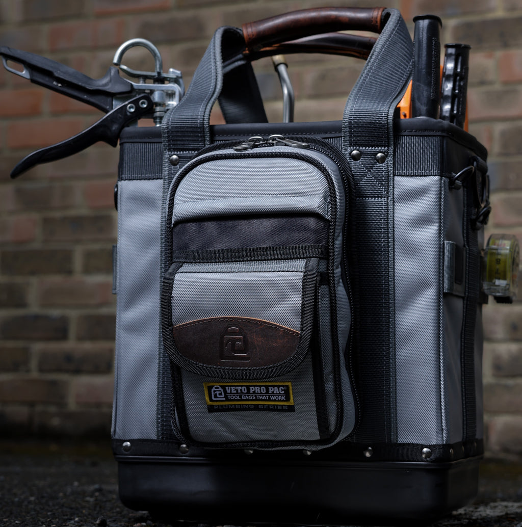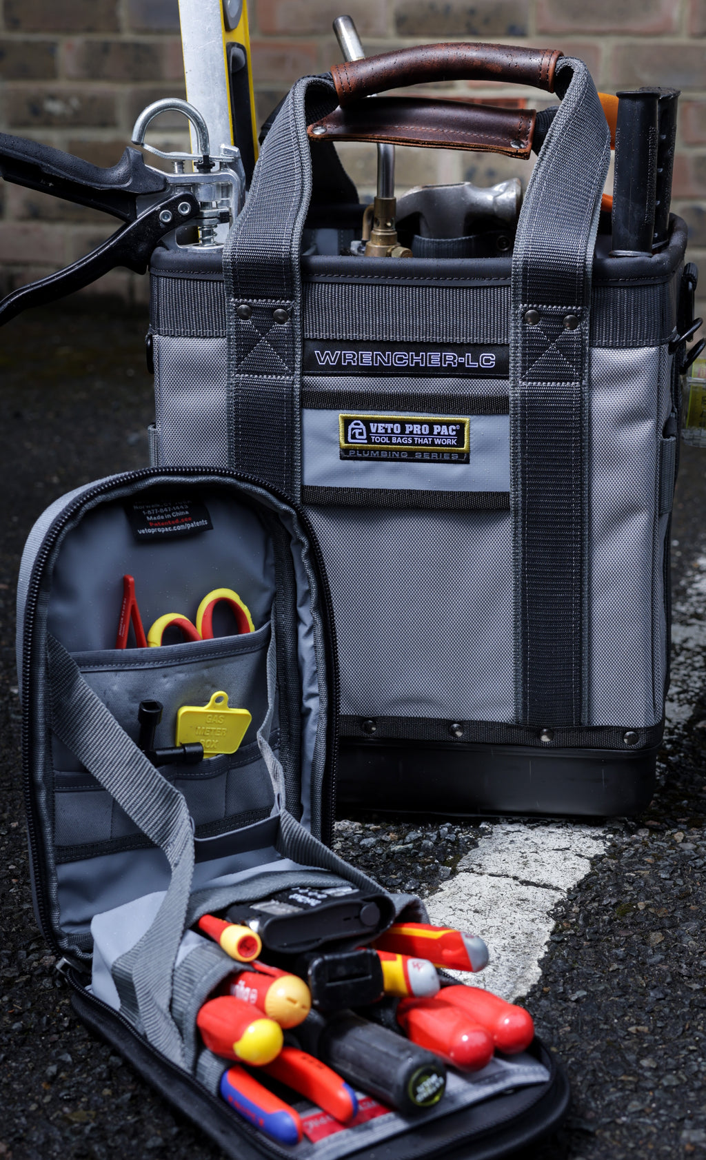 The WRENCHER-LC is the large-sized open top vertical tool storage bag. Both the WRENCHER-LC and larger WRENCHER-XL share the same vertical storage zones and zippered pouch that can removed, stuffed, and magnetically secured into a rear pants pocket or under a belt. The two V-SWAP™ panels can be removed to create additional interior volume for bulk storage or transporting power tools. All WRENCHER bags feature a water-repelling tarpaulin interior for easy clean up, and an injection molded waterproof base.