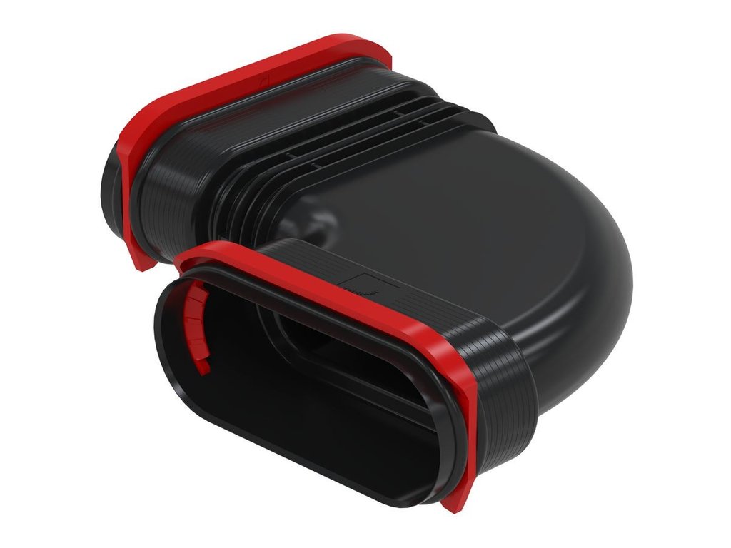The Zehnder ComfoTube Flat 51, horizontal 90° bend is a rigid bend can be placed between two lengths of Zehnder ComfoTube Flat 51 or directly into the manifold and comes complete with locking slides and oval O-rings. It measures 57mm high x 213mm wide x 250mm deep.